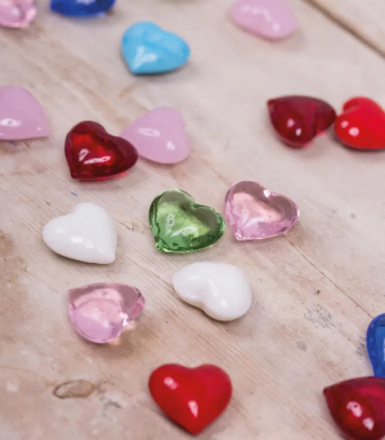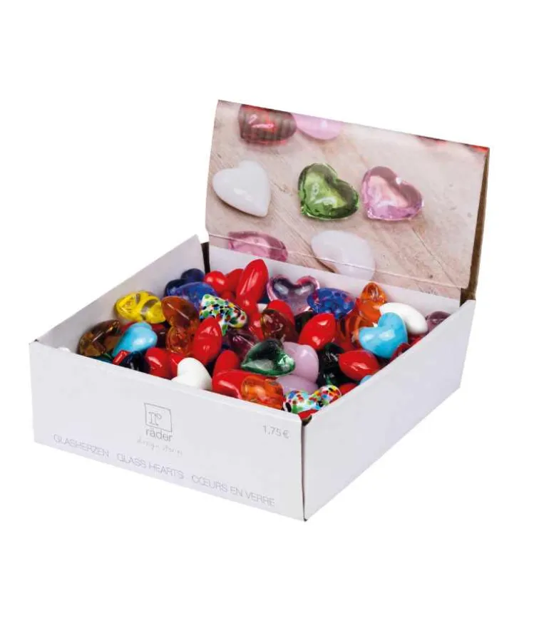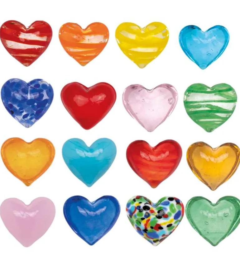 Håndlavede glashjerter i forskellige farver. Kan bruges som en lille mindeting.