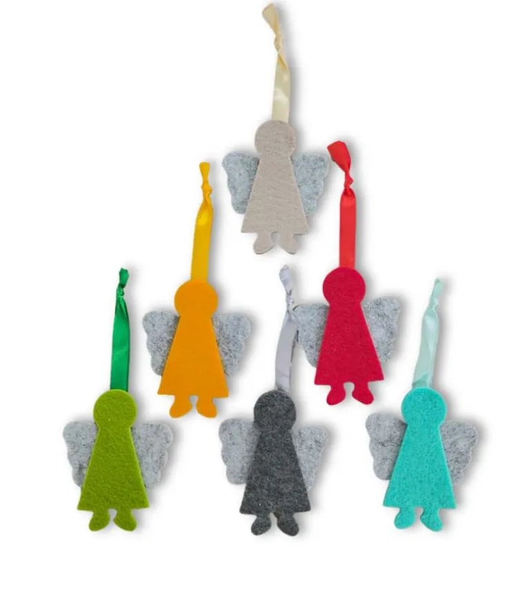 Hver engel er i to farver og med et fint satin bånd. Englen kan hænges på skoletasken. Eller på juletræet. I nøglebundten. Ja, alle mulige steder.