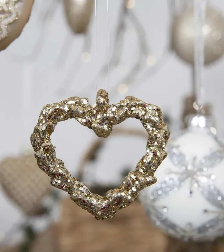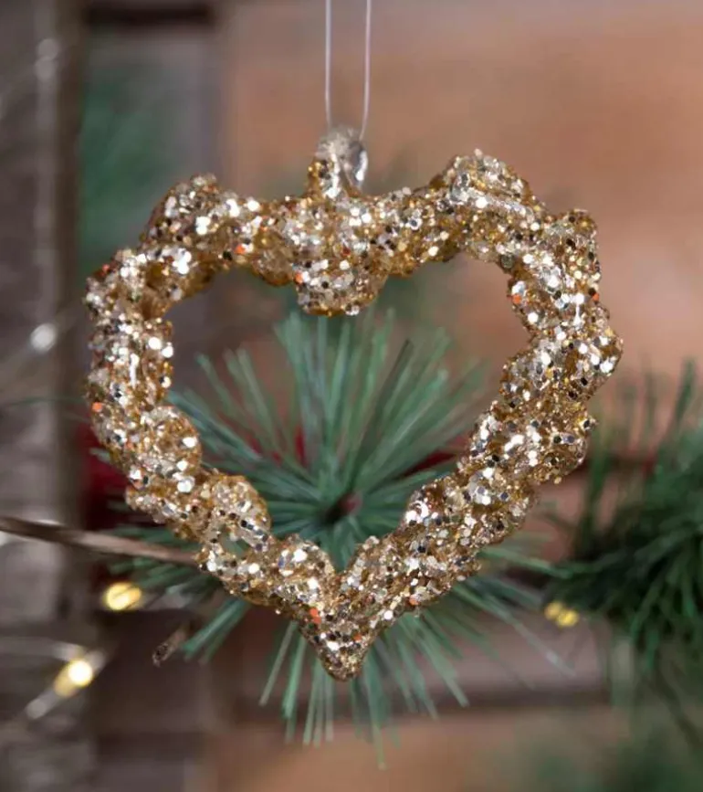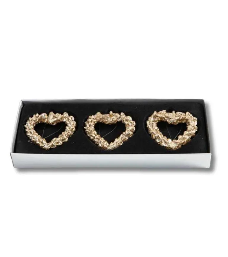 Her får du 3 guldhjerter med glimmer i en flot æske. De er smukke at hænge på juletræet, eller måske på en gren.