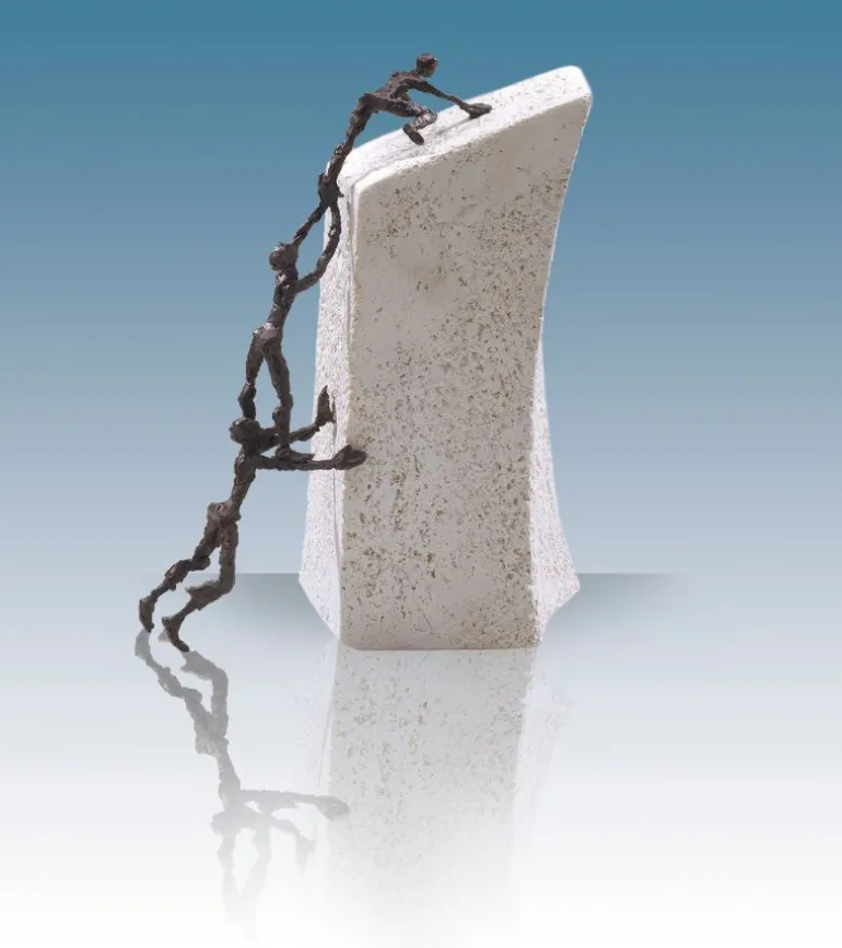 Bronzefigur på stentøjssokkel. Sammen når vi længst. Om at stole på sin partner og viljestyrken for at nå det fælles mål – sådan når man længst. Figur med tre mennesker der sammen når toppen. Igen af dem ville kunne gøre det alene men sammen kan de. Sammenhold, samarbejde og fællesskab er hvad denne skulptur illustrerer.