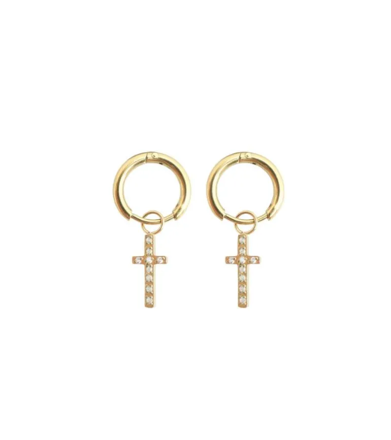 Smukke creol ørering med kors i rustfri stål, der er belagt med 14 Karat guld.