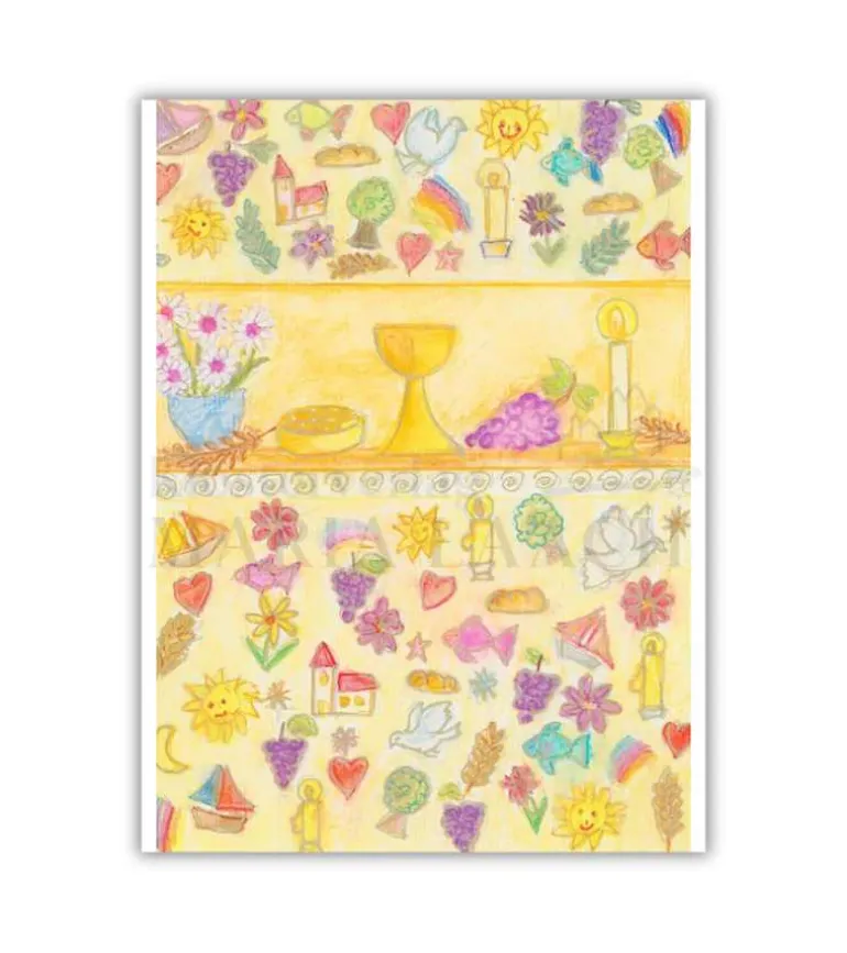 Dette fine dobbeltkort med kuvert kan bruges til mange anledninger. Barnedåb, konfirmation. Eller til en voksen, der skal have en hilsen. De mange symboler er alle ting man kan relatere til kirken og troen.