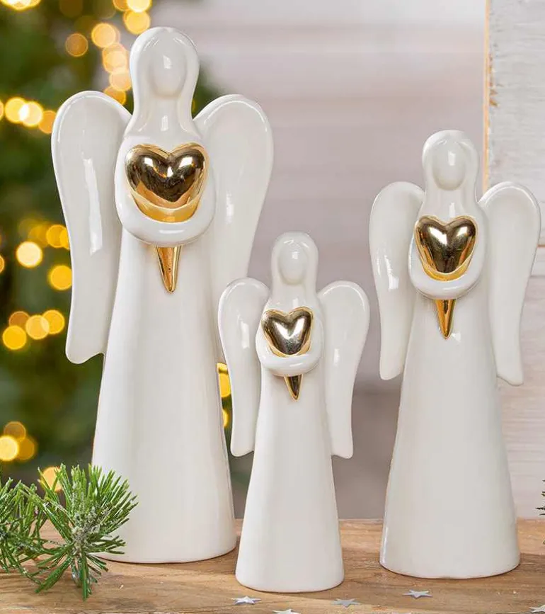 Denne engel er virkelig smuk i hvidt porcelæn og et fint guldhjerte i favnen.