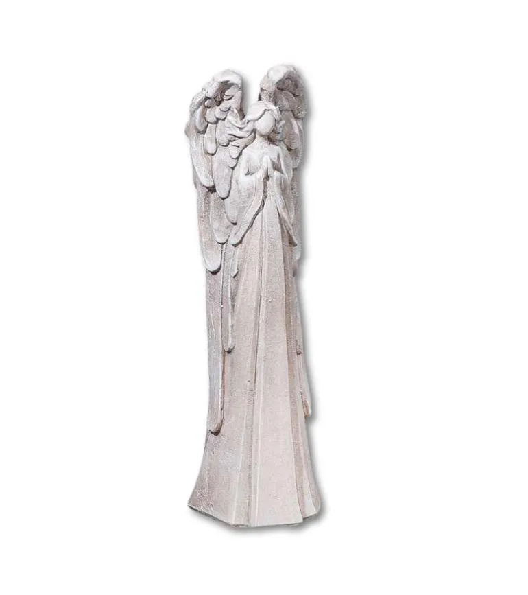 Englen er lavet i Polyresin, der er et hårdfør materiale. Derfor kan den tåle at stå ude.