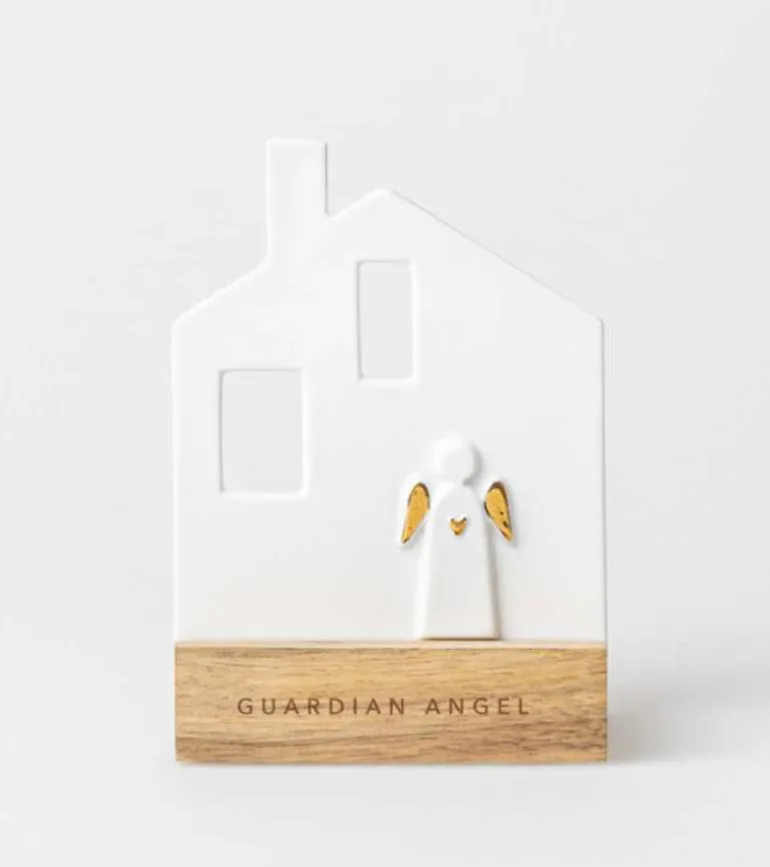 Fint lille hus i hvidt porcelæn, hvor en engel står uden for og passer på dem i huset.
