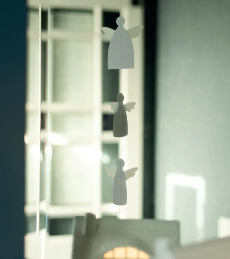 Smuk papirssnor med 7 engle på. De er i farverne hvid og sølv.