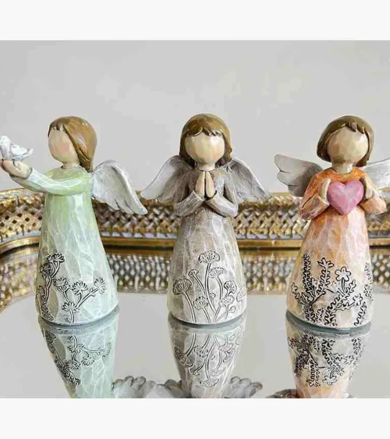En fin lille englepige med blå-grå kjole. Hun har hænderne foldet.