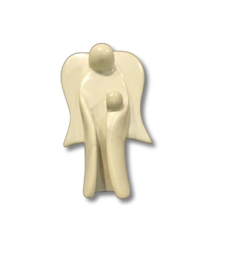 Flot skulptur lavet i fedtsten- I grå/hvid farve. En engel der beskytter et menneske.