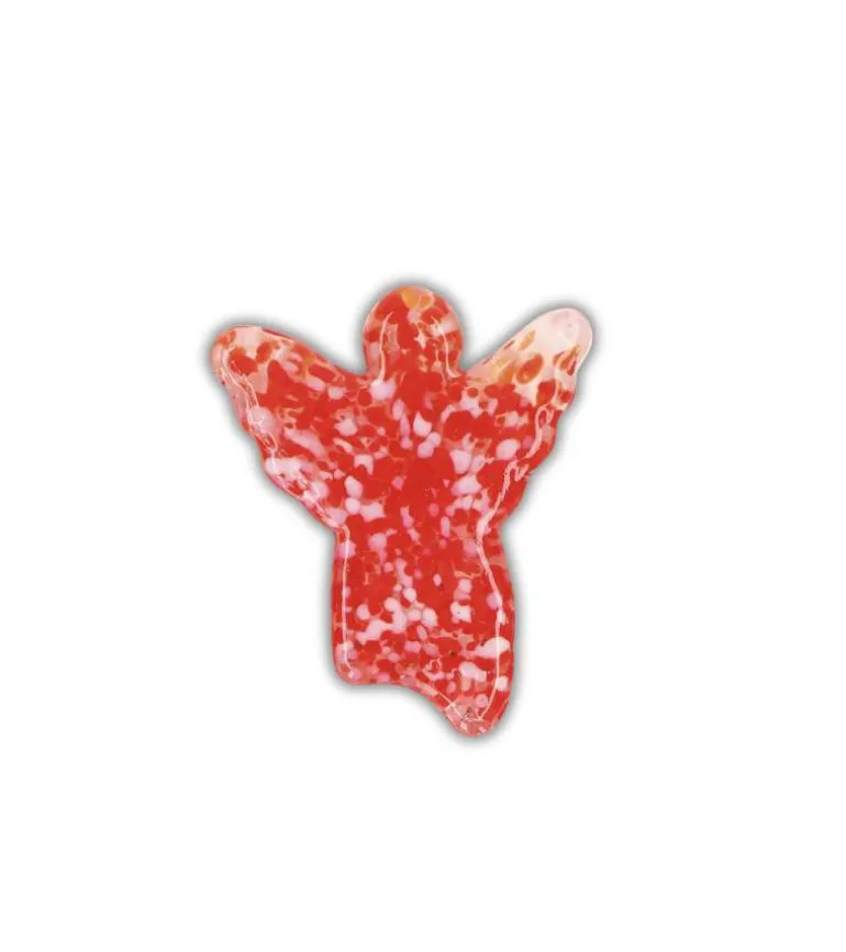 En lille glasengel til lommen, der er lavet i rødt og hvidt smelteglas i form af en engel.