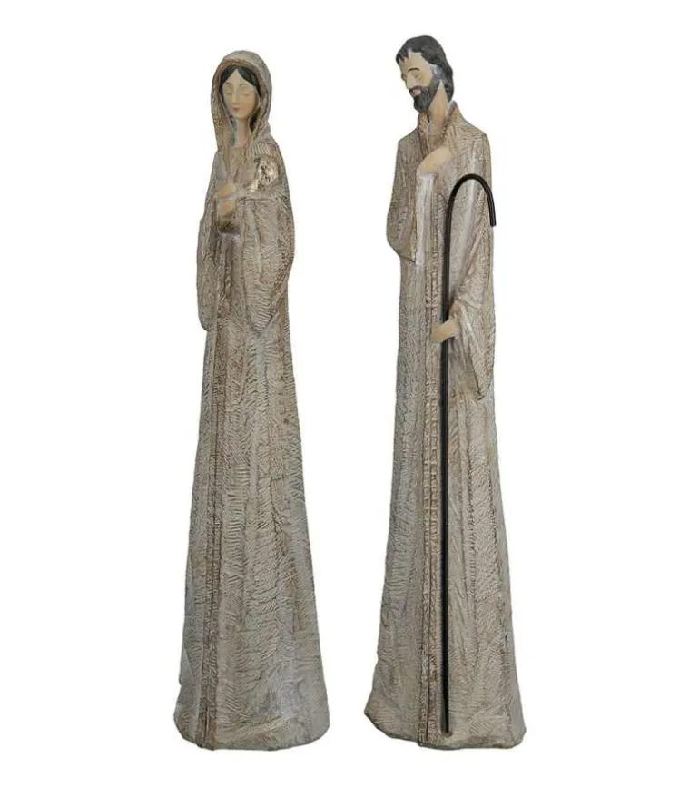 Meget elegant julekrybbe, med Maria som står med jesubarnet i favnen og Josef ved siden af.