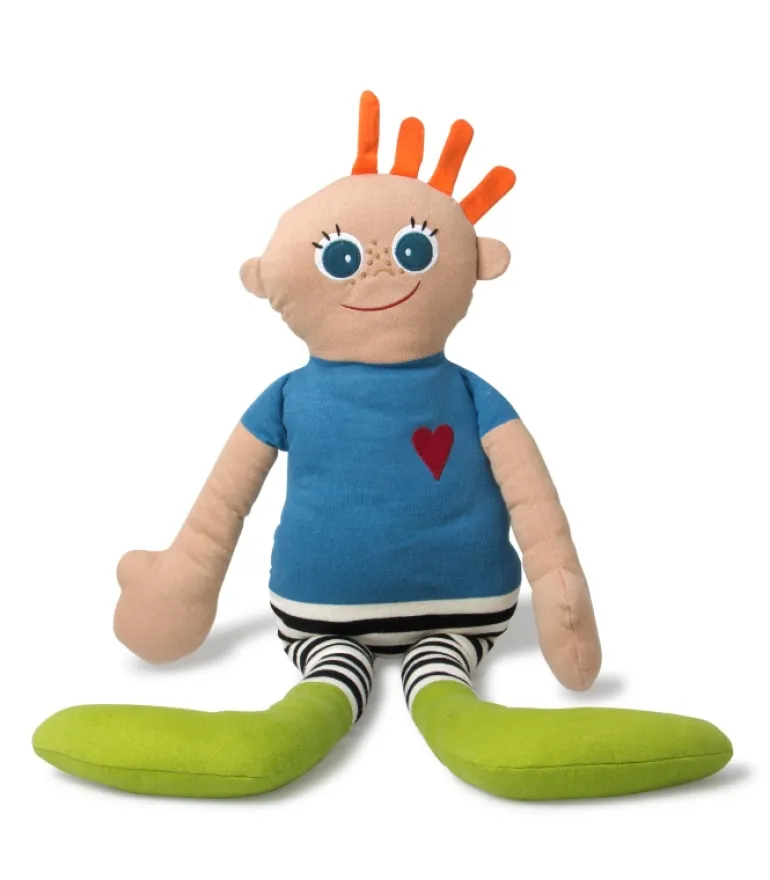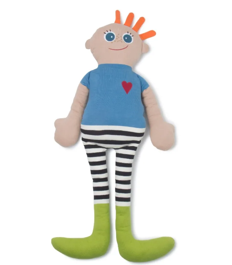 Kæmpe KAI dukke på 1 meter i højden. Blå t-shirt, stribede ben og grønne sokker.