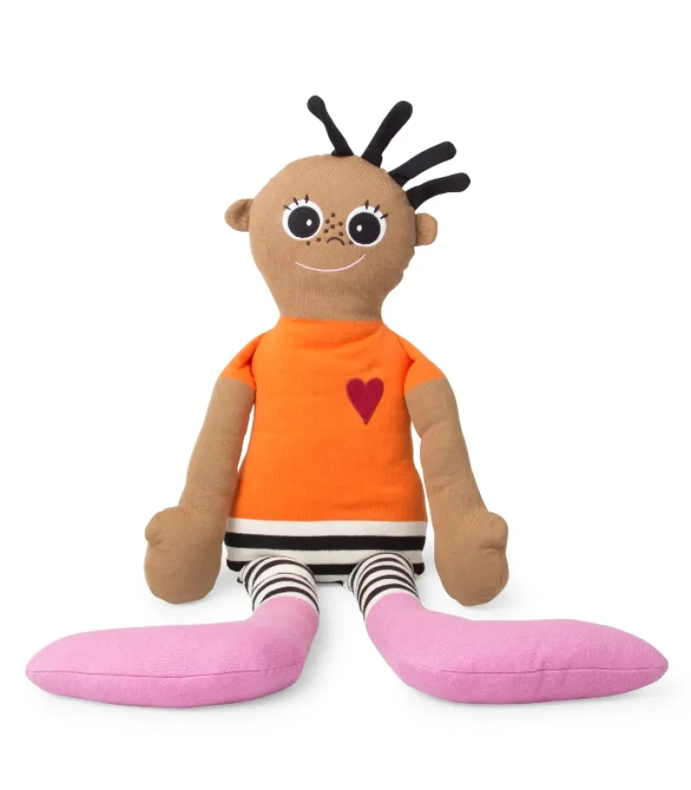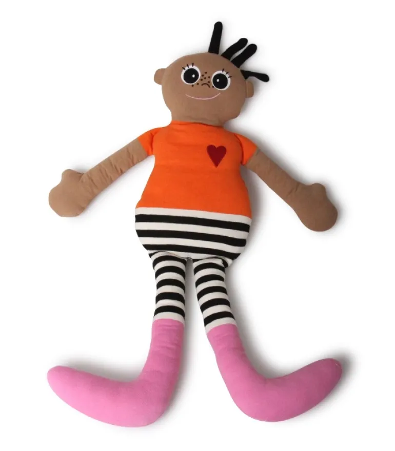 Stor KAI dukke – 1 meter høj – med orange t-shirt , pink sokker og sort/hvis stribede ben. Fine håndbroderede detaljer.
