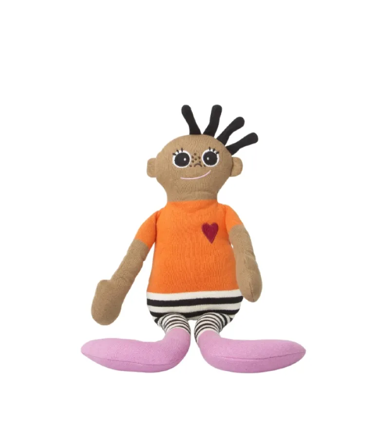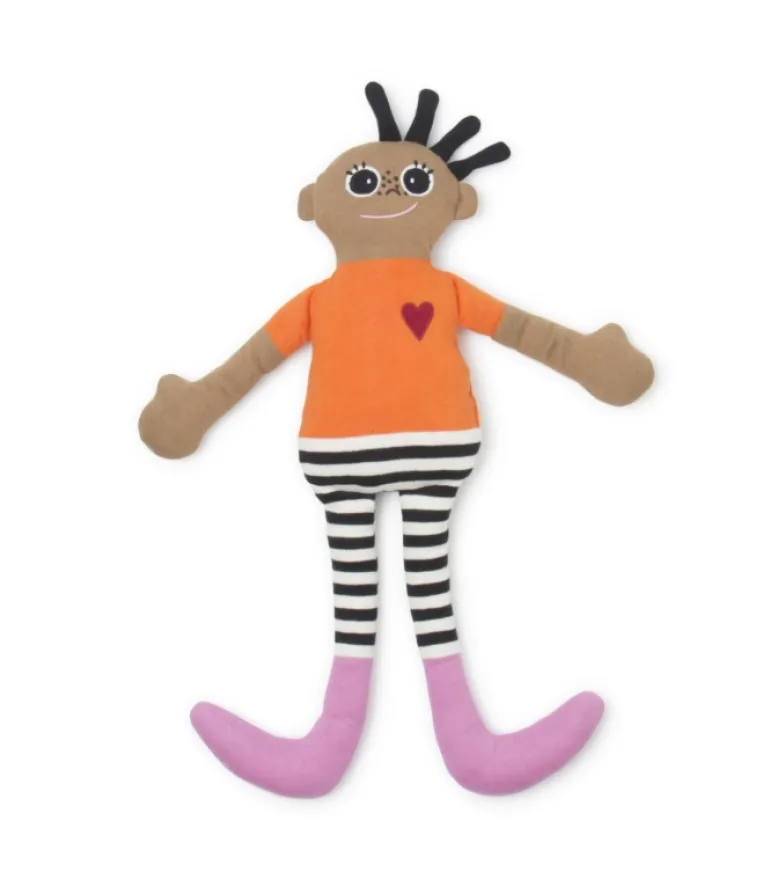 KAI dukken har Orange bluse, pink fødder, lange stribede ben og et fint rødt hjerte.