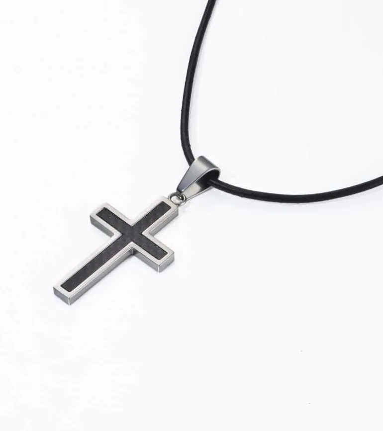Korset er lavet i rustfri stål og fyldt ud med sort carbon.