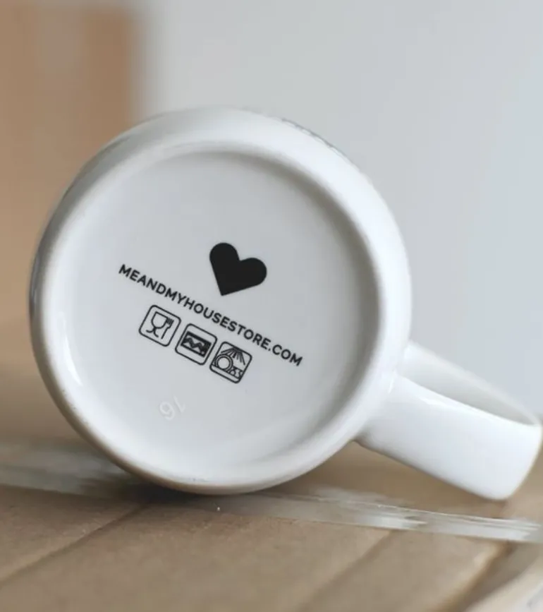 Kruset er hvidt med sort tryk både for- og bagsiden.
