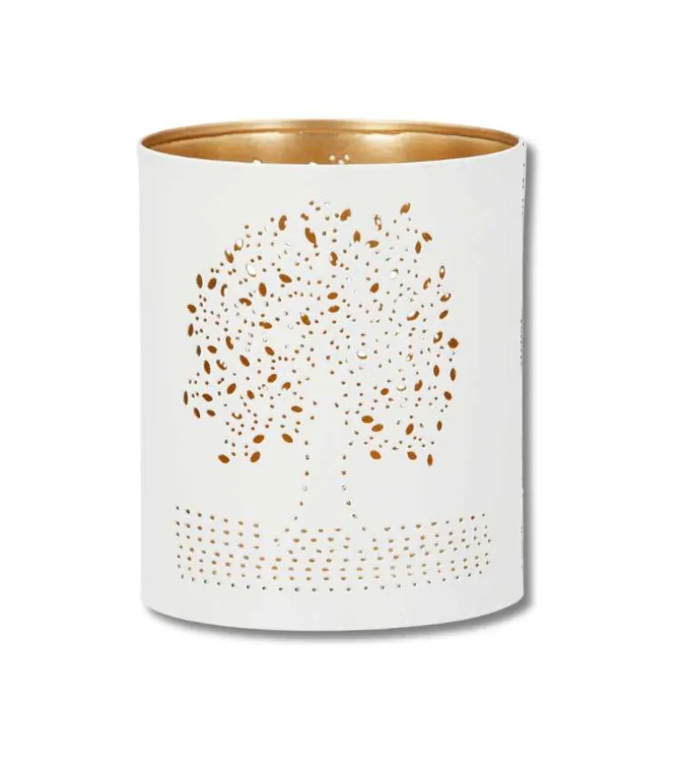 Livets træ præget ind i en lille fin hurricane stage i metal, der er hvid på ydersiden og guld på indersiden.