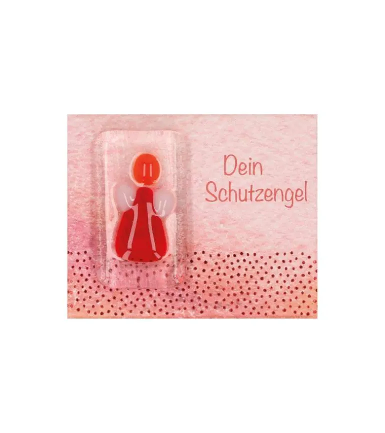 En lille firkantet rød glasengel til lommen.