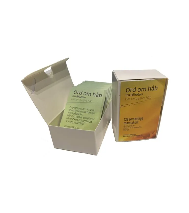 Mannakort med titlen “Ord om håb” er 128 forskellige kort med ord fra Bibelen om det evige livs håb.
