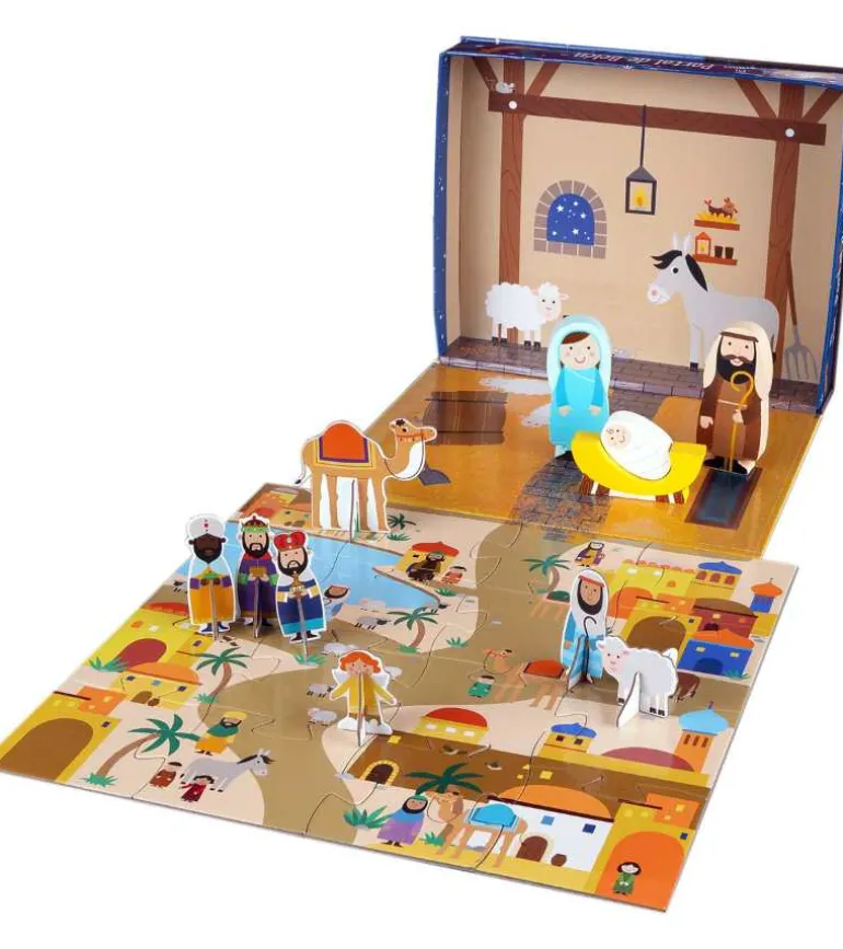 Dette fine sæt indeholder en bog om julen, Et puslespil med vejen til Betlehem, Træfigurer med Maria, Josef og Jesu i krybben. Og papfigurer af De 3 visemænd og englen.