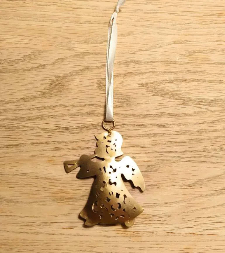 Simpel og pæn guld engel med trompet til ophæng, med unik hulmønster design.
