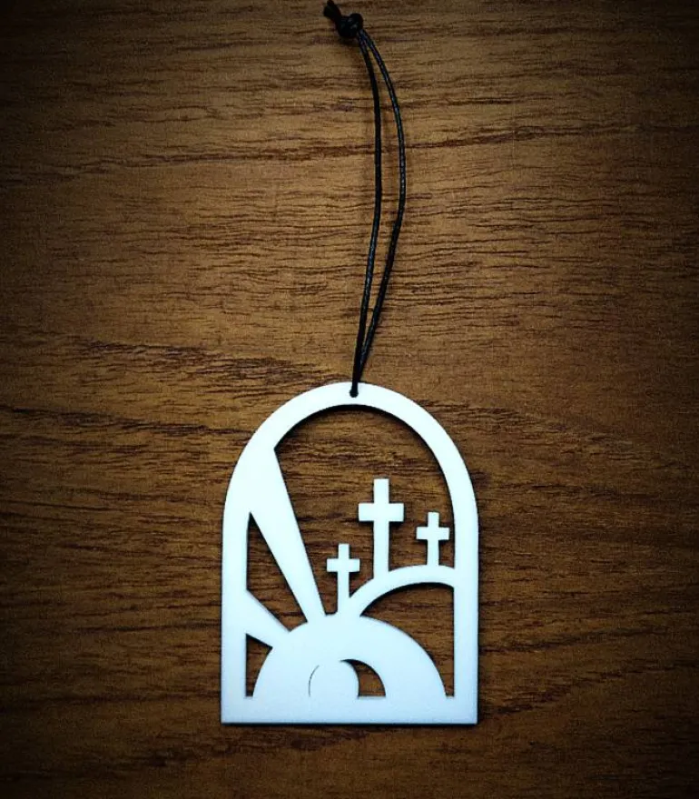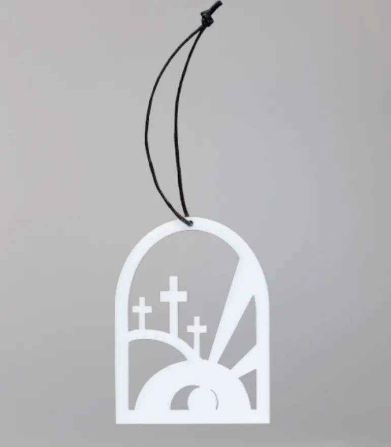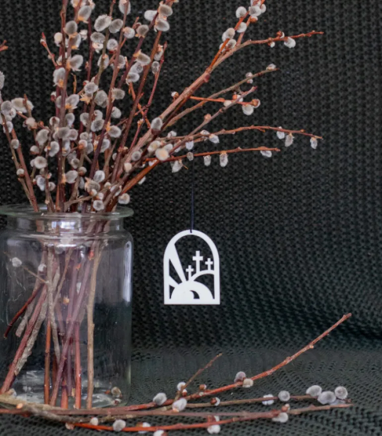 Ophænget er vores fortolkning af Påskemorgen, hvor Jesus er opstået fra døden. Matt. 28,1-7