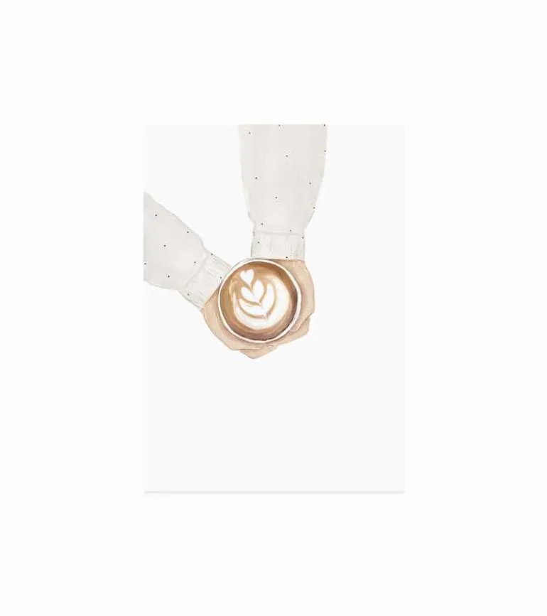 Flot postkort med en varm kop kaffe der bliver omfavnet; perfekt til en kaffe elsker!