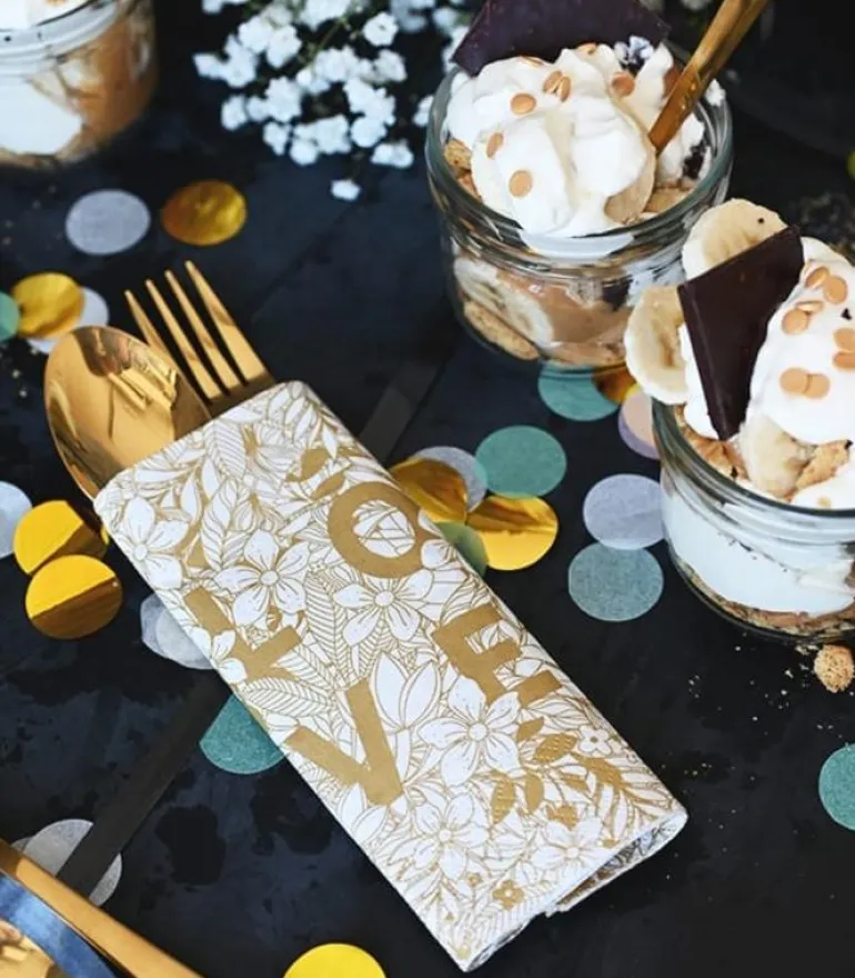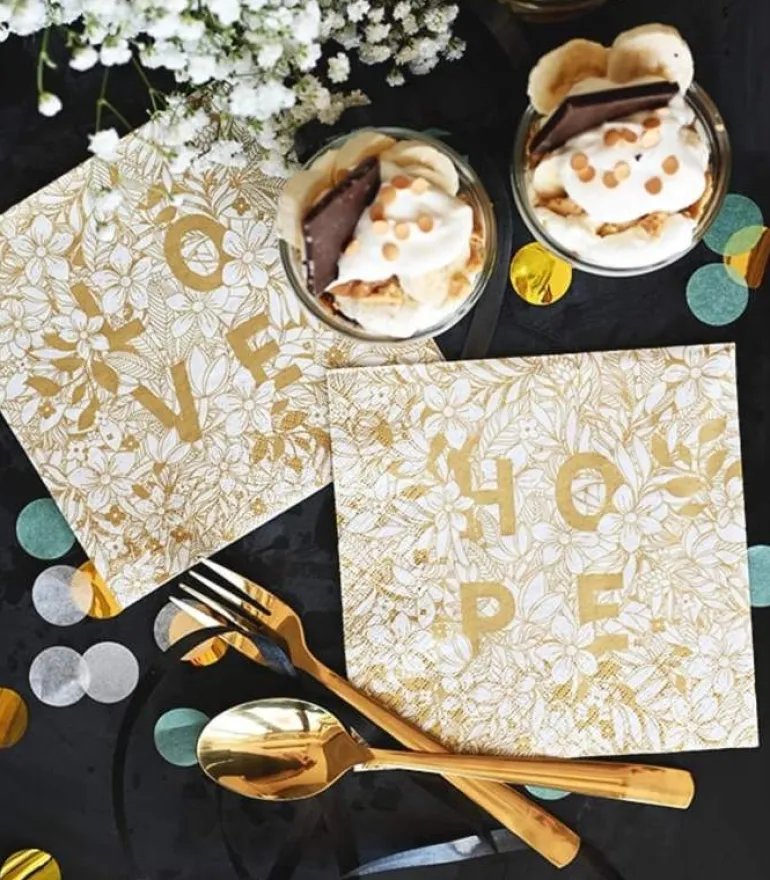 Flotte servietter med guldtrykt HOPE på to af siderne og LOVE på de to andre sider.