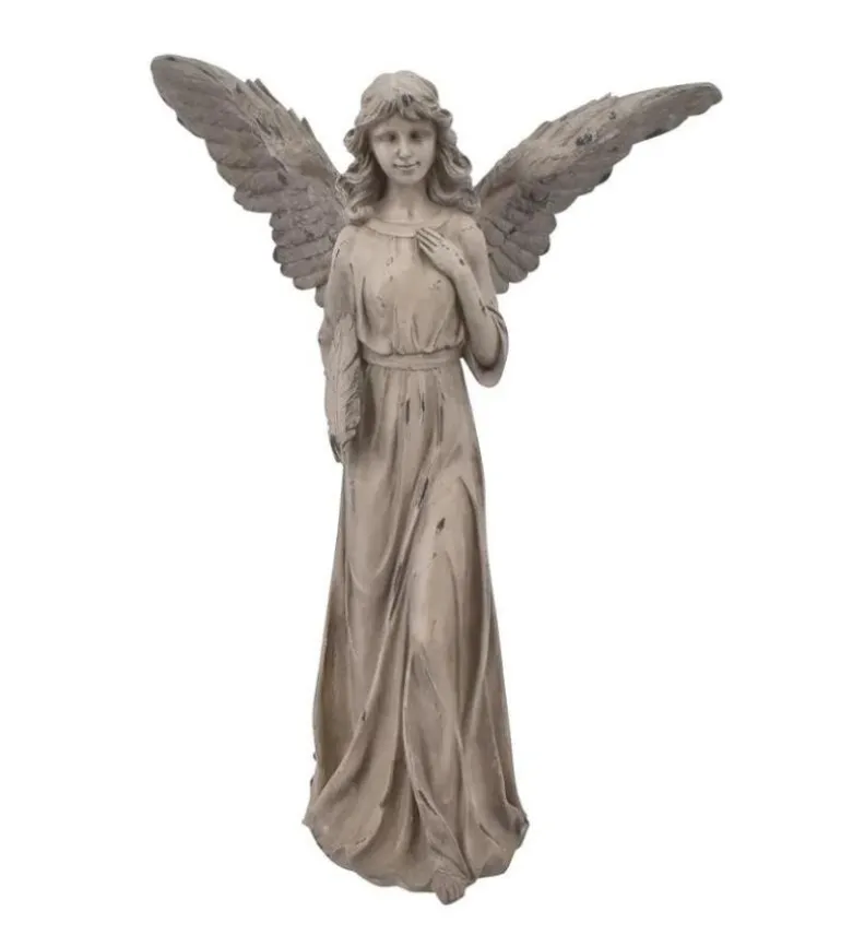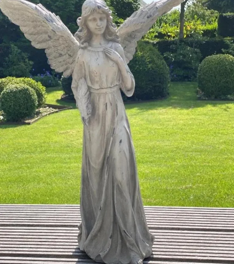 Stor smuk engel, der står med en fjer. Den kan stå inde som ude.