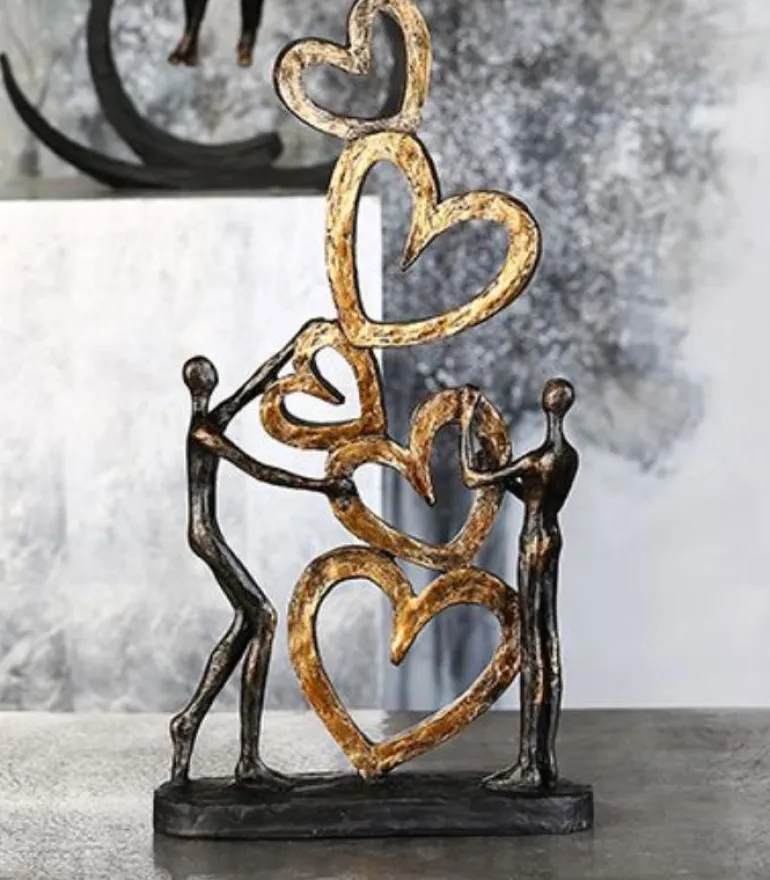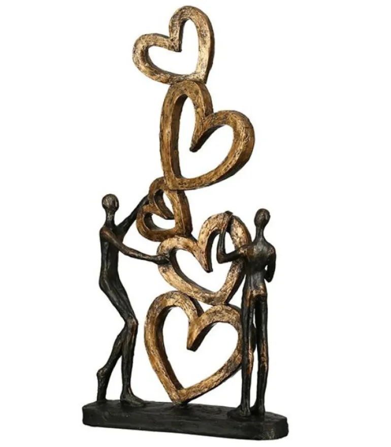 Stor og flot skulptur med et par, der bygger et hjem med kærlighed, symboliseret med 5 hjerter stablet oven på hinanden.