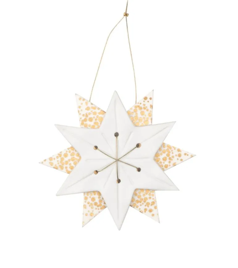 Elegant stjerne ophæng i tyndt porcelæn og pergament papir. Stjernen er samlet med en tynd guldtråd.