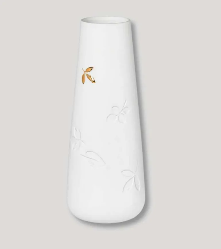 Håndmalet vase med fine græs og blad aftryk. Et enkelt smukt blad skiller sig ud med sin guldfarve. Vasen har en slank silhuet og har rå porcelæn på ydersiden og glaseret på indersiden.