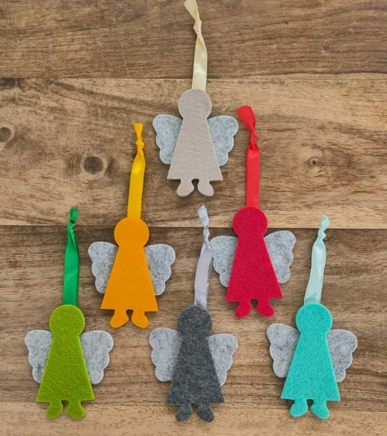 Hver engel er i to farver og med et fint satin bånd. Englen kan hænges på skoletasken. Eller på juletræet. I nøglebundten. Ja, alle mulige steder.