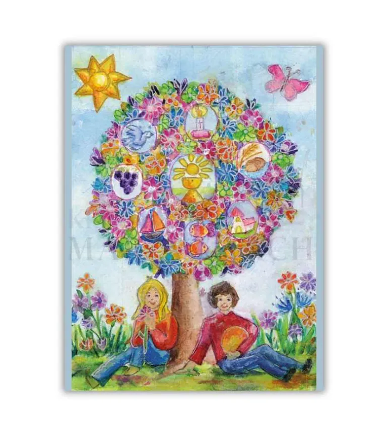 Dobbeltkort med kuvert. Med et billede af et smukt maleri af to børn, der sidder under et farverigt træ, hvor kristne symboler findes i trækronen.