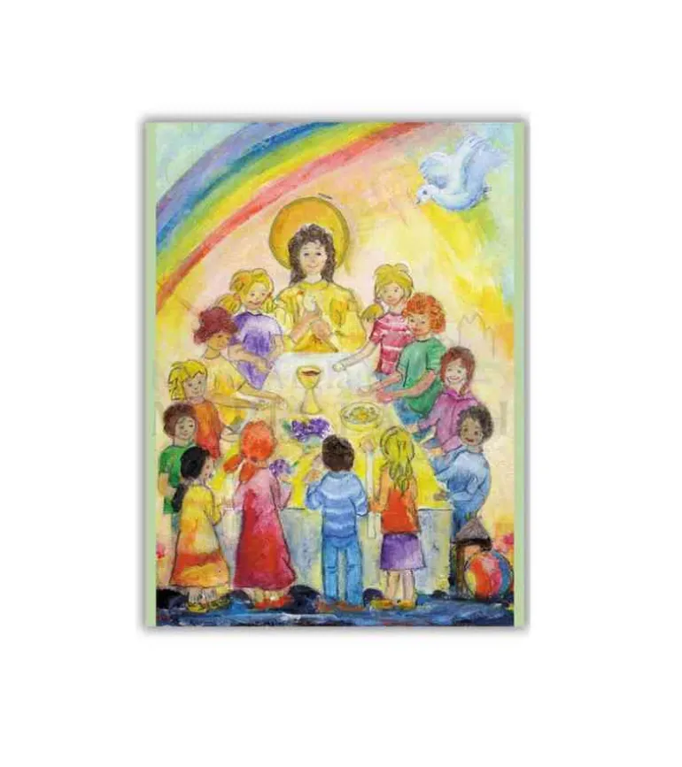 Skønt dobbeltkort i dejlige farver med et billede af Jesus, der har festmåltid med børn i alle aldre.