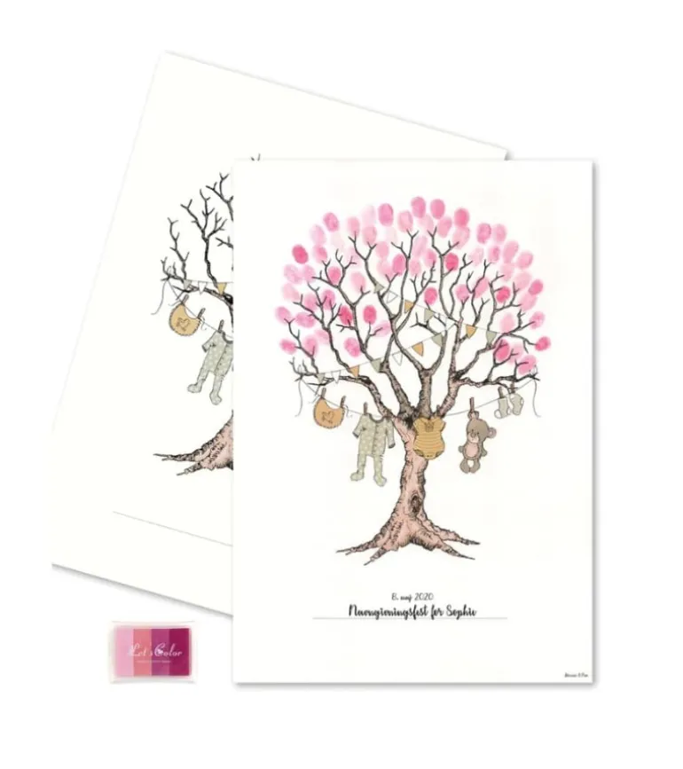 Smuk og unik fingerprint plakat med barnedåbstræ på – med plads til alle gæsternes personlige fingeraftryk.