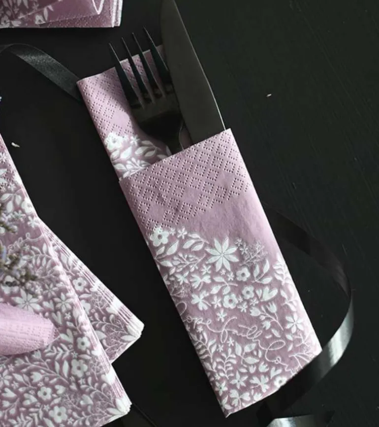 Servietterne er fyldt med små blomster og rundt i en cirkel står der FAITH – HOPE – LOVE (Tro – håb – kærlighed)