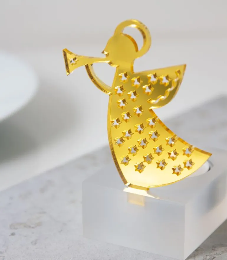 Englen er lavet i gul plexiglas. Bagsiden er sølv, og det giver en flot effekt, så englen kommer til at ligne guld.