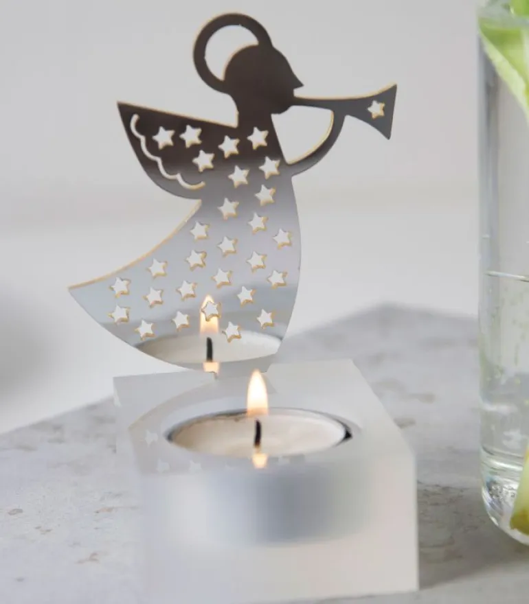 Fin lille stage med en engel til et fyrfadslys.