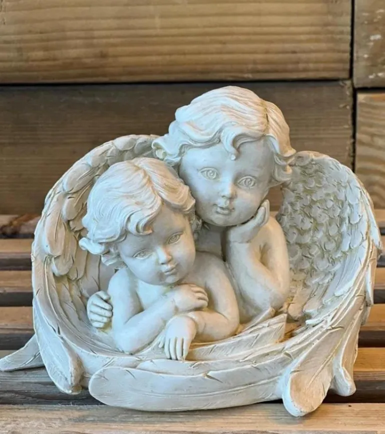 To små engle der ligger i et par vinger. De er i antik hvid.