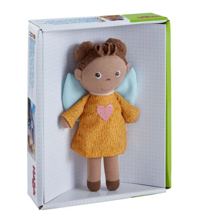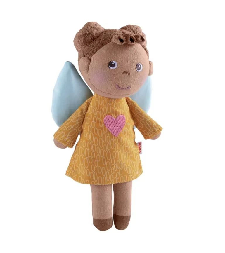 Fineste lille engel dukke fra HABA med en fin mørk hudfarve. Hun hedder Nora men vil gerne have et nyt navn. Hun er en trofast lille ven til alle nyfødte og små børn.