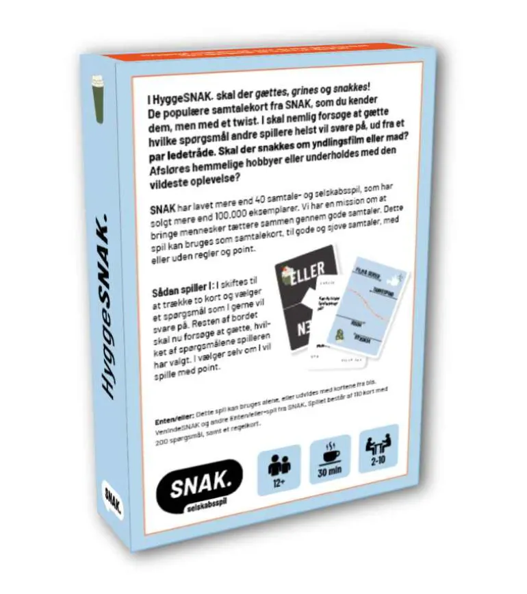 HyggeSNAK er et samtalespil, hvor I både skal skiftes til at vælge spørgsmål I gerne vil svare på, og gætte på hvilke spørgsmål I tror hinanden vil svare på. Spillet slutter, når I har fået snakket helt ud.