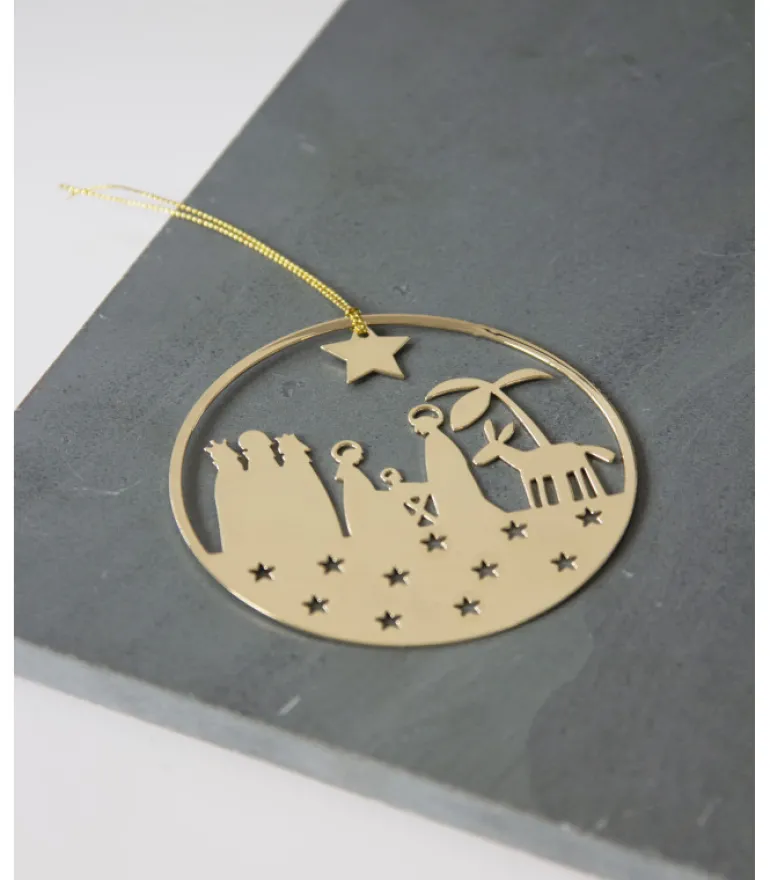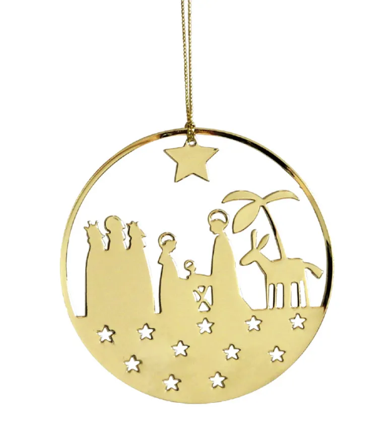 Flot på juletræet eller en gren. Ophænget illustrerer Josef og Maria i stalden og de vise mænd.