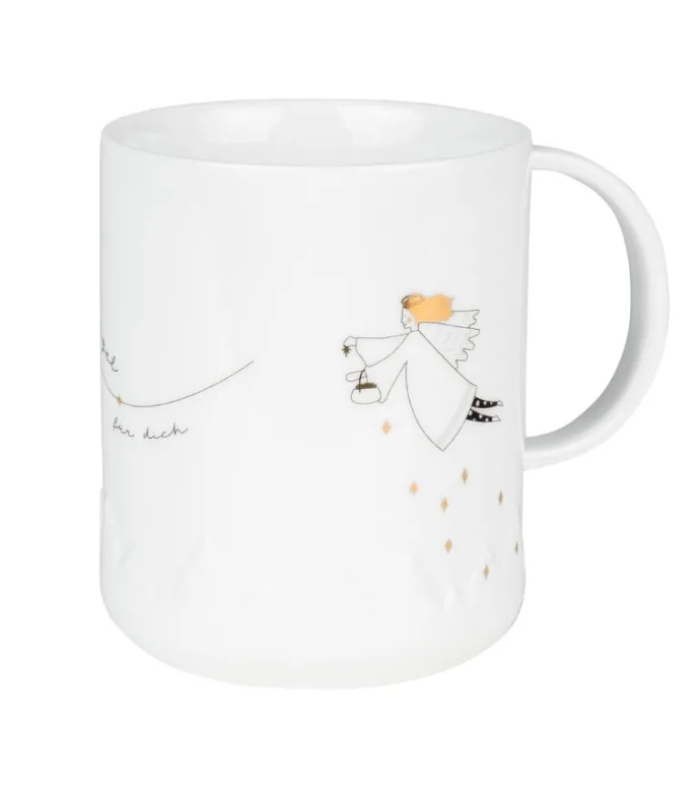 Lækkert krus i porcelæn med et par guardian angels på og andre fine detaljer med stjerner og bjergtinder.
