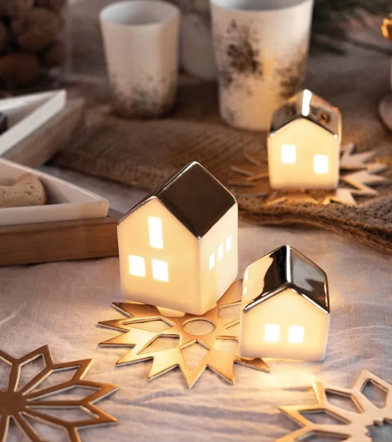 Fint LED lyshus i smukt snehvidt porcelæn med guld/metallisk tag.