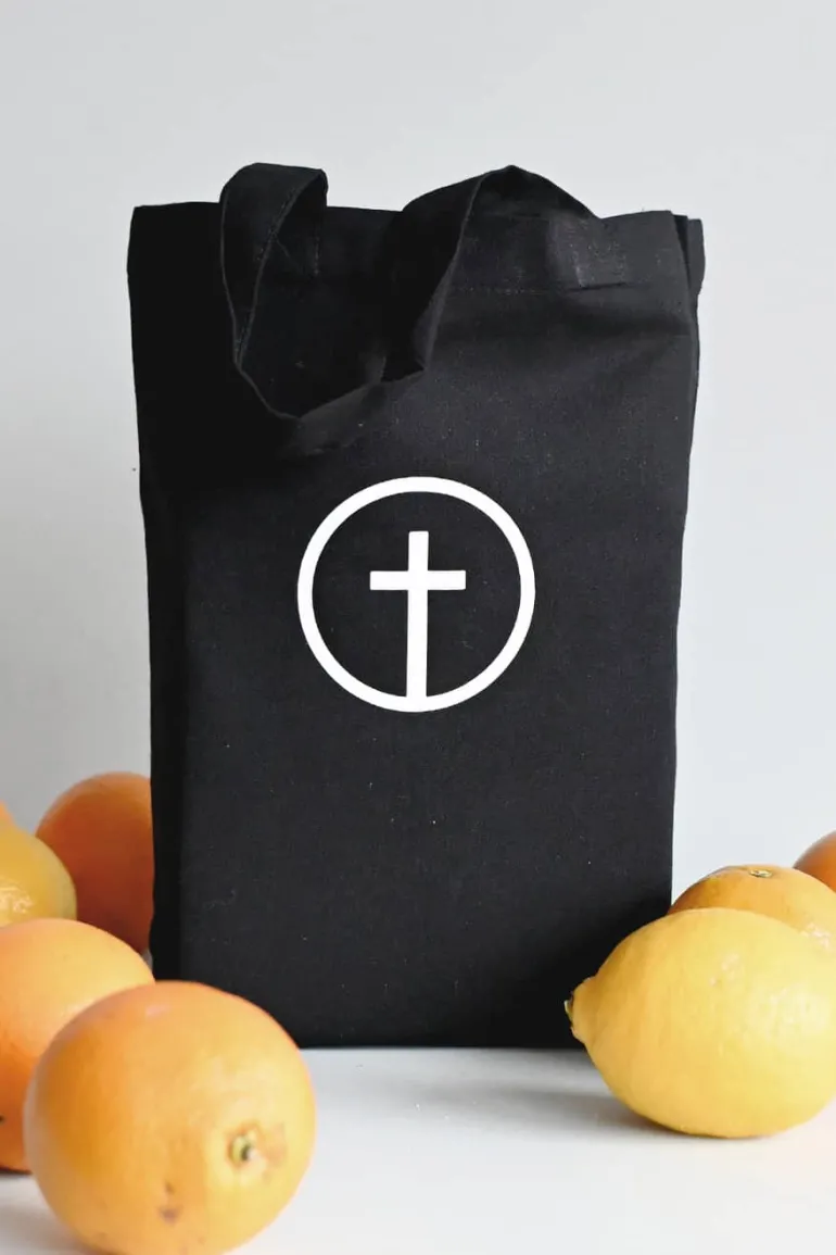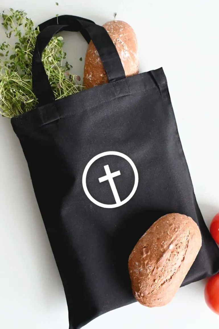 En lille fin mulepose som kan bruges til madpakken eller strikketøjet. Stofposen er fremstillet i ökotex bomuld og har to korte hanke og et hvidt kors print i midten.