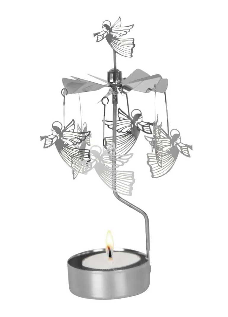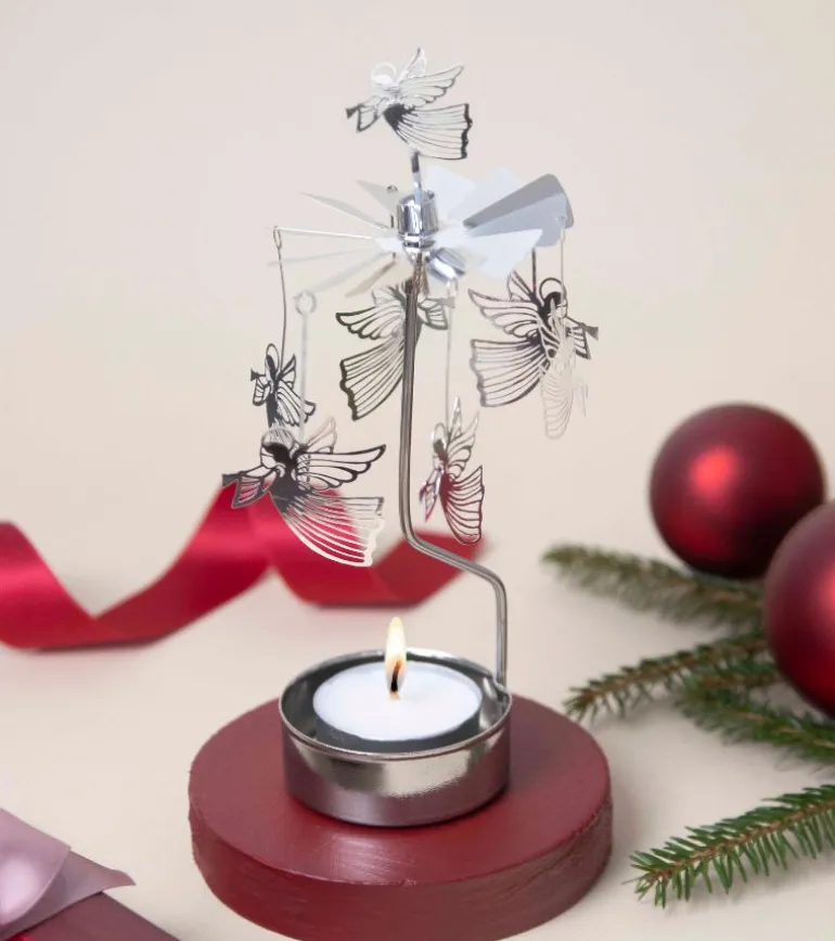 Når fyrfadslyset er tændt gør varmen at at englene begynder at rotere rundt.