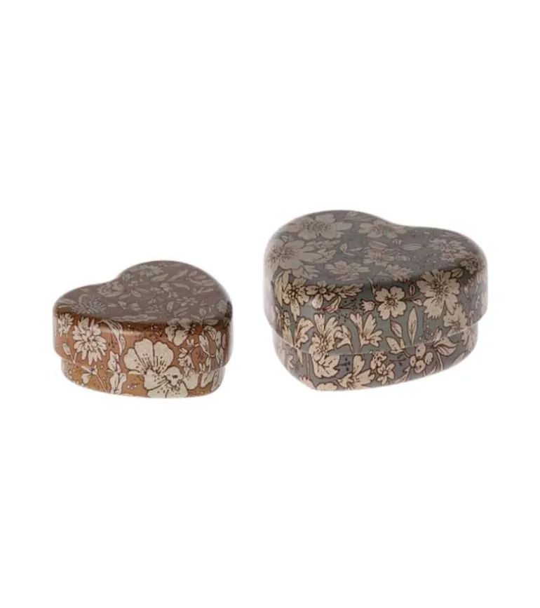 Her får du 2 søde små hjerteæsker, en i blå og en i okker. Fra Maileg. Brug den som tanddåse til børnenes mælketænder eller pilledåse.