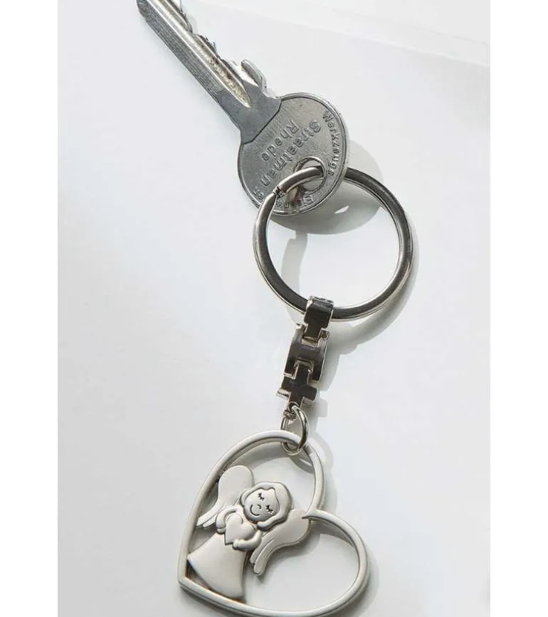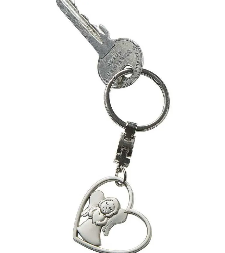 Solid Nøglering i metal med en lille sød engel, der står med et hjerte og omringet af et hjerte.
