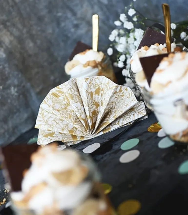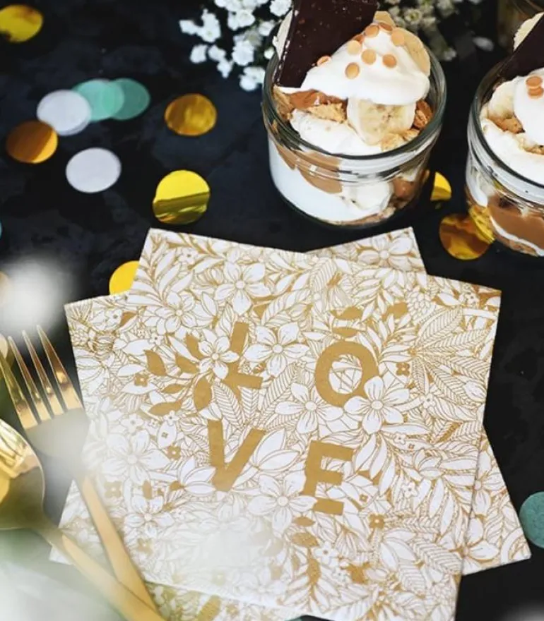 Flotte servietter med guldtrykt HOPE på to af siderne og LOVE på de to andre sider.