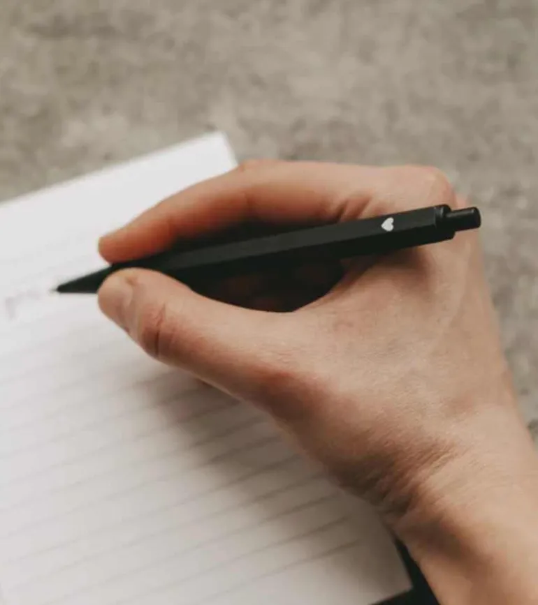 Skriver med sort blæk.